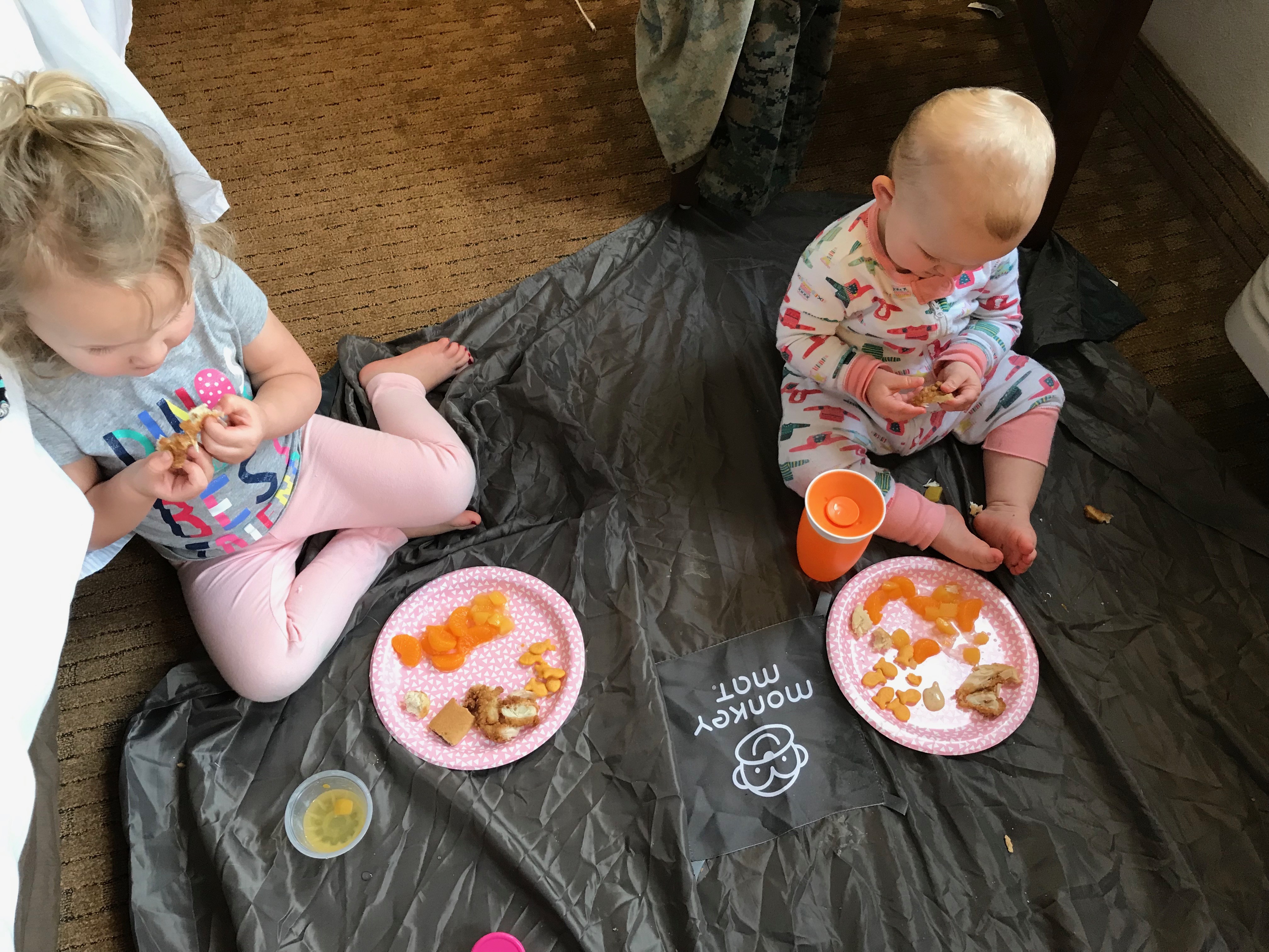 • A designated blanket or mat to sit on. We carry a packable Monkey Mat in the car with us to throw out at a park, use as a changing pad, or even as a picnic blanket in a hotel room. You never know where you might need a clean surface to sit, so this is an easy but extremely useful item to throw in!