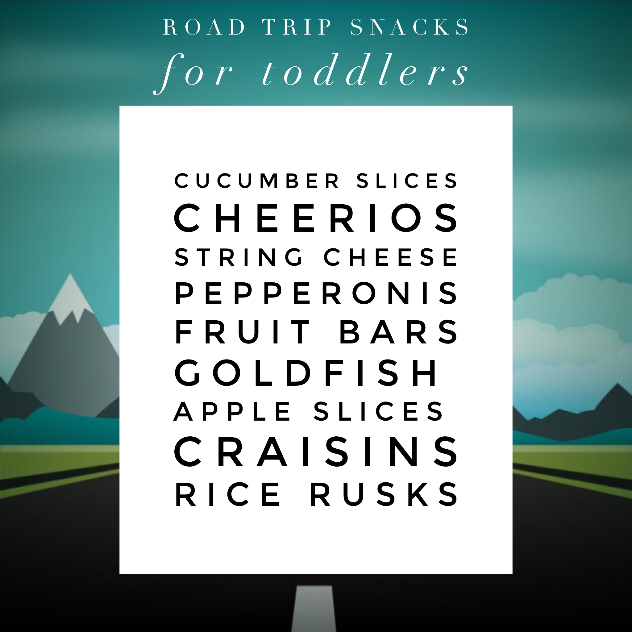 Snacks will be your BEST FRIEND. And they don’t have to be pure garbage. I know I always splurged on car snacks as a kid. Peach rings, potato stix, sour gummy crawlers, soda after soda…good times. And while a treat here and there might be nice, the last thing you want strapped in a carseat for hours is a toddler hopped up on sugar. Remember in Jurassic Park when they tied the dinosaurs down? That’s what you’re stuck in a car with. So here are some of our favorite crowd-pleasers that are yummy and also fairly safe to eat in a carseat. (Definitely watch ALL carseat snacking closely and I highly recommended investing in a mirror to see your back-facing babes if you don’t have one already.)