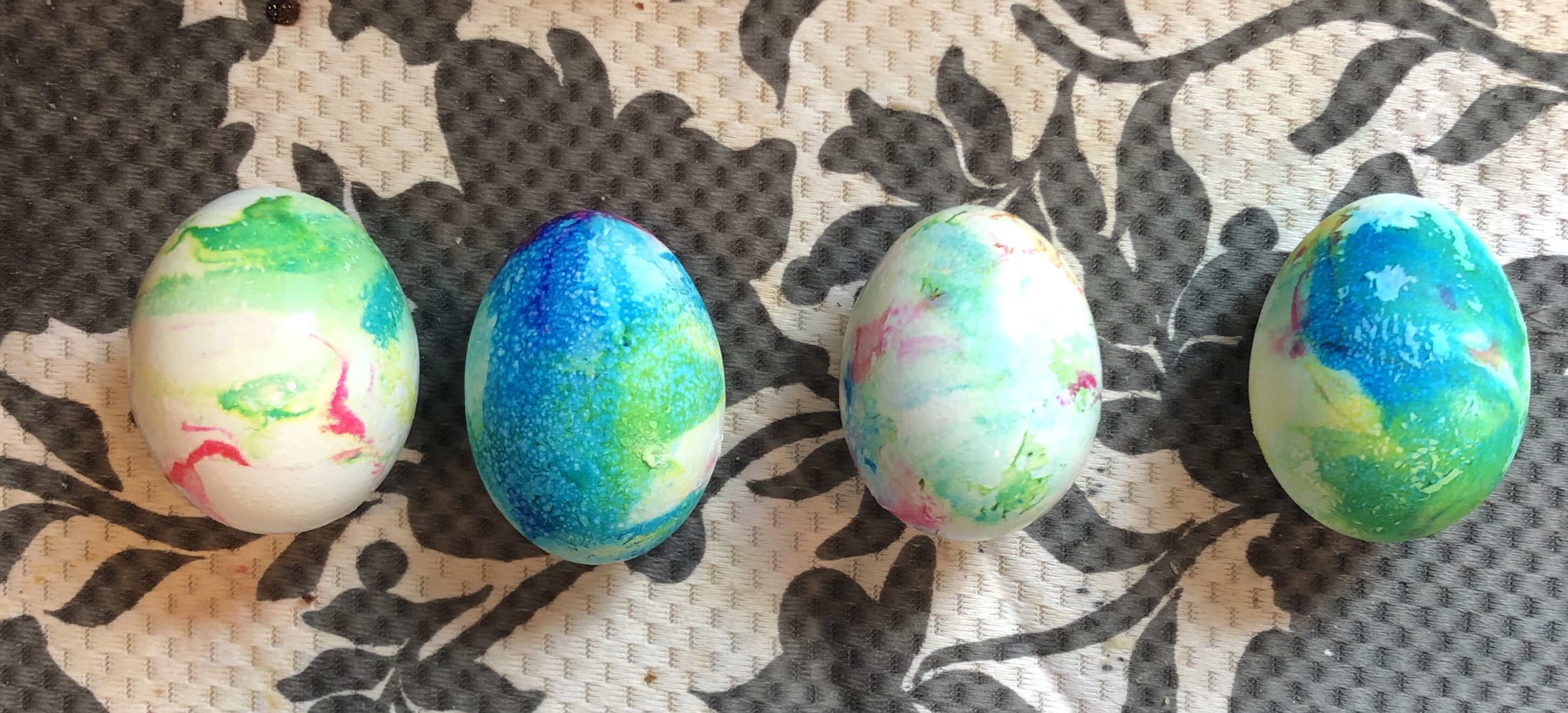 It was a fun way to dye eggs without the worry of the babies eating something they shouldn’t. The eggs turned out gorgeous as well.