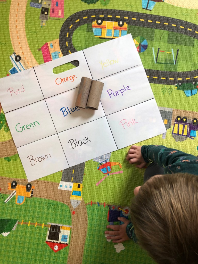 While making the grid, have your child color the toilet or paper towel rolls. Once they are done coloring, take some tape and tape the rolls together. Now, you are ready to go on a color hunt!