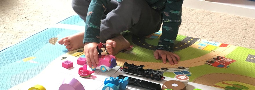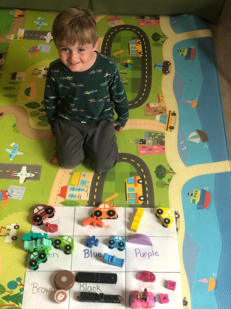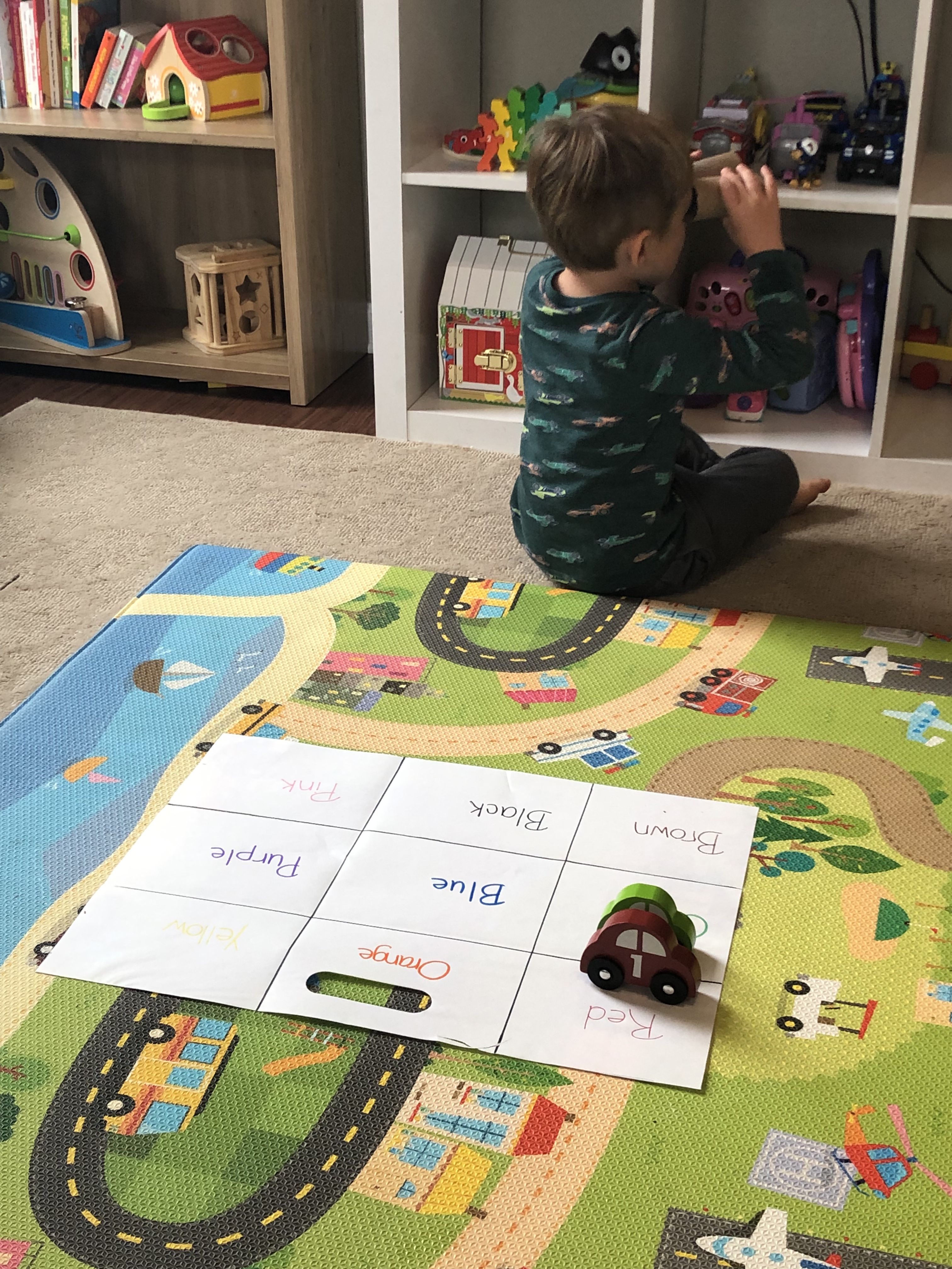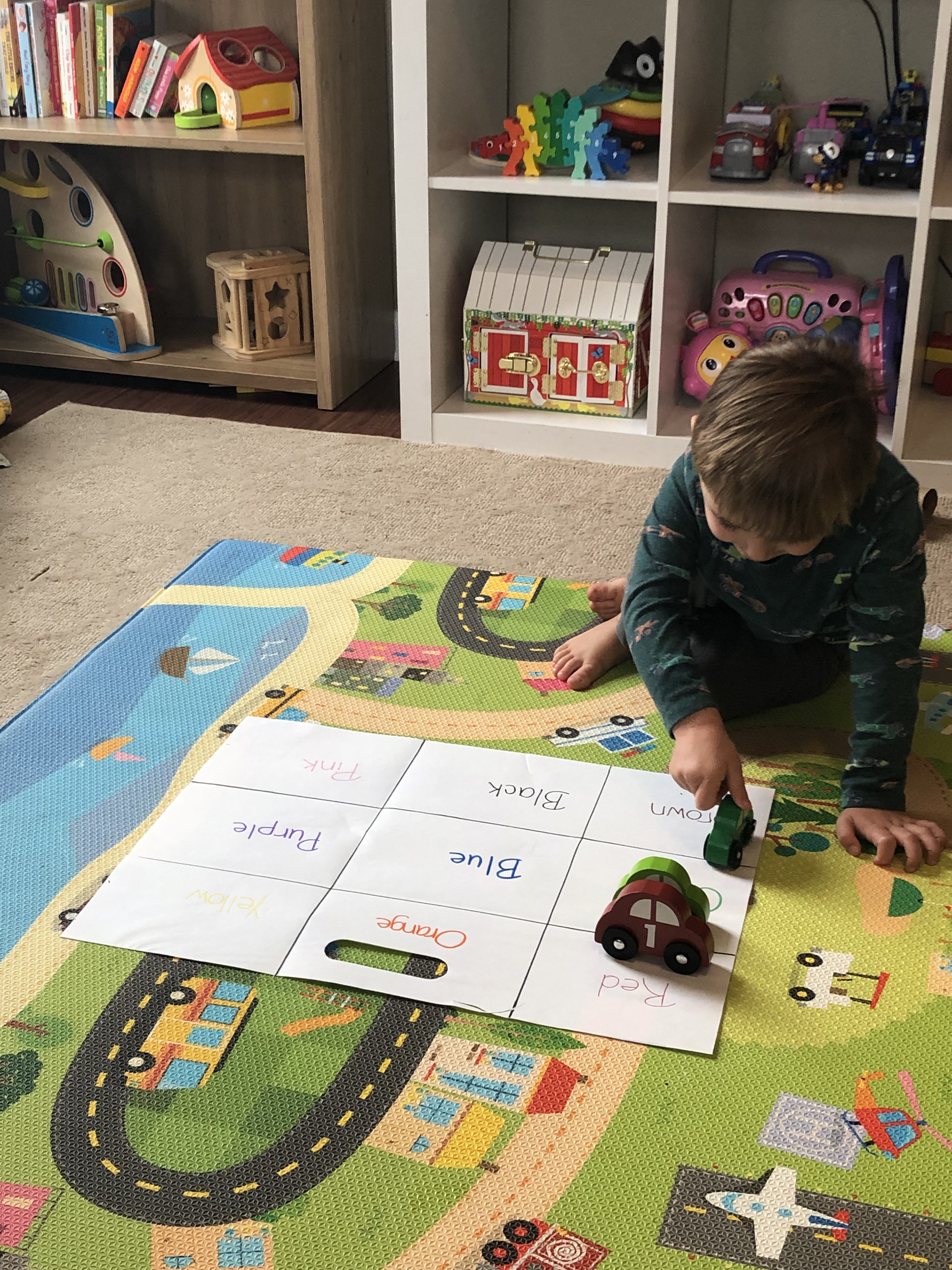 As we came inside to take a break from playing in the rain, I noticed all the colors dancing around our playroom. I realized that the toys we play with day in and day out are, in themselves, a learning tool. So, we went on a treasure hunt, well, a color hunt. You’ll see what I mean.