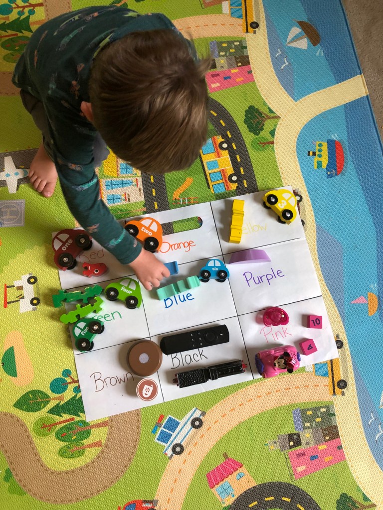 Place the piece of paper in the middle of the room and let your kiddo go to work. Have them look around and find anything they can that matches the colors in your grid. Gray loved looking through his binoculars to find each new item.