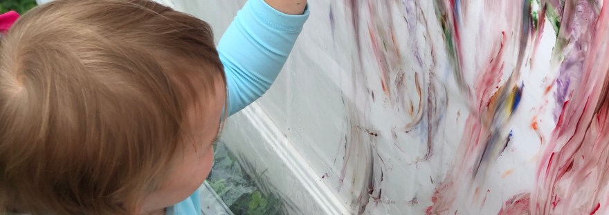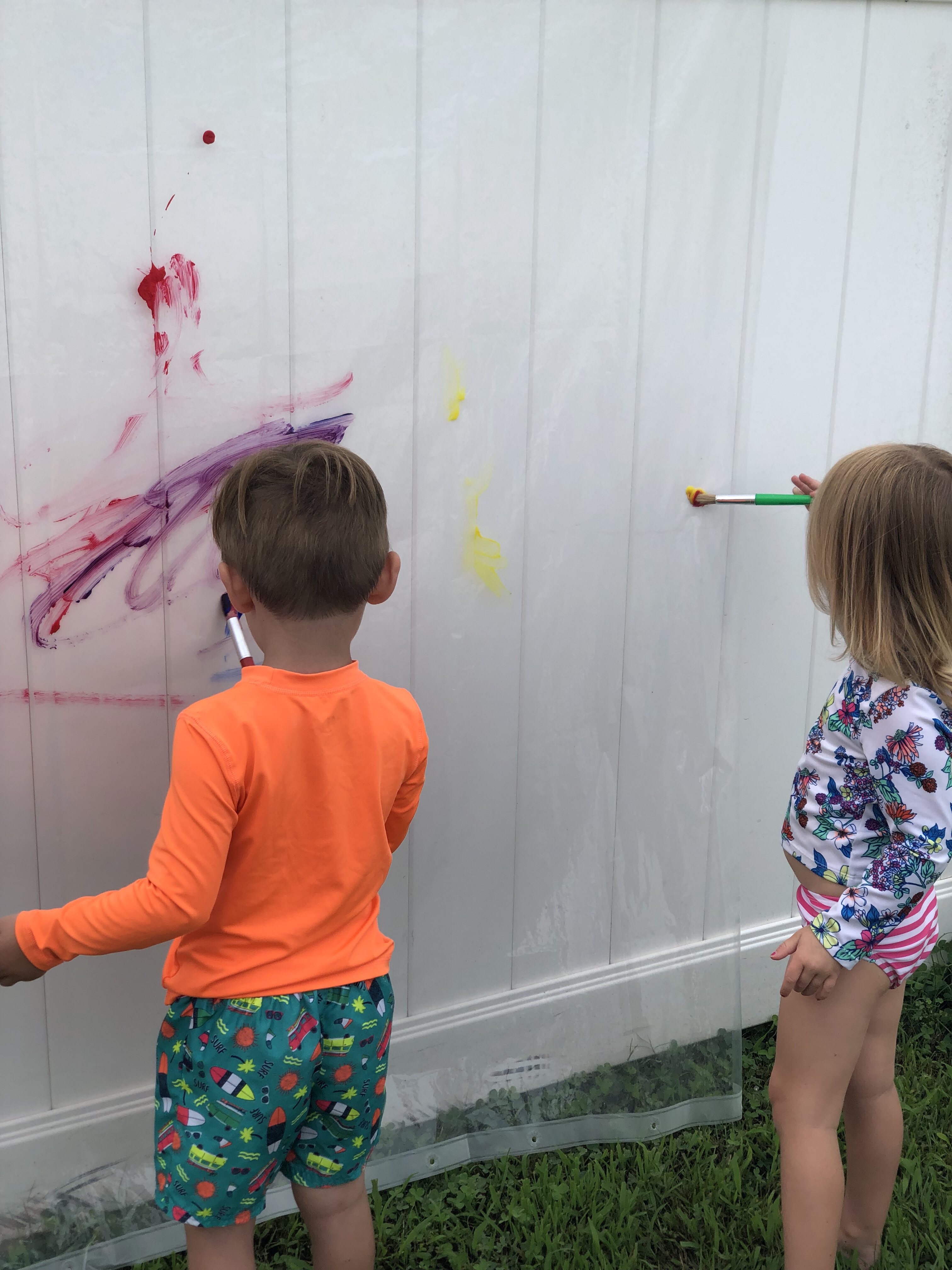 They started off with paint brushes and quickly changed to finger painting! They mixed colors, painted the curtain, and some on the fence. Thankfully, the washable paint sprayed right off with the hose.