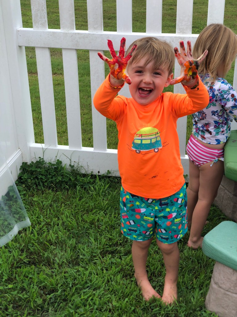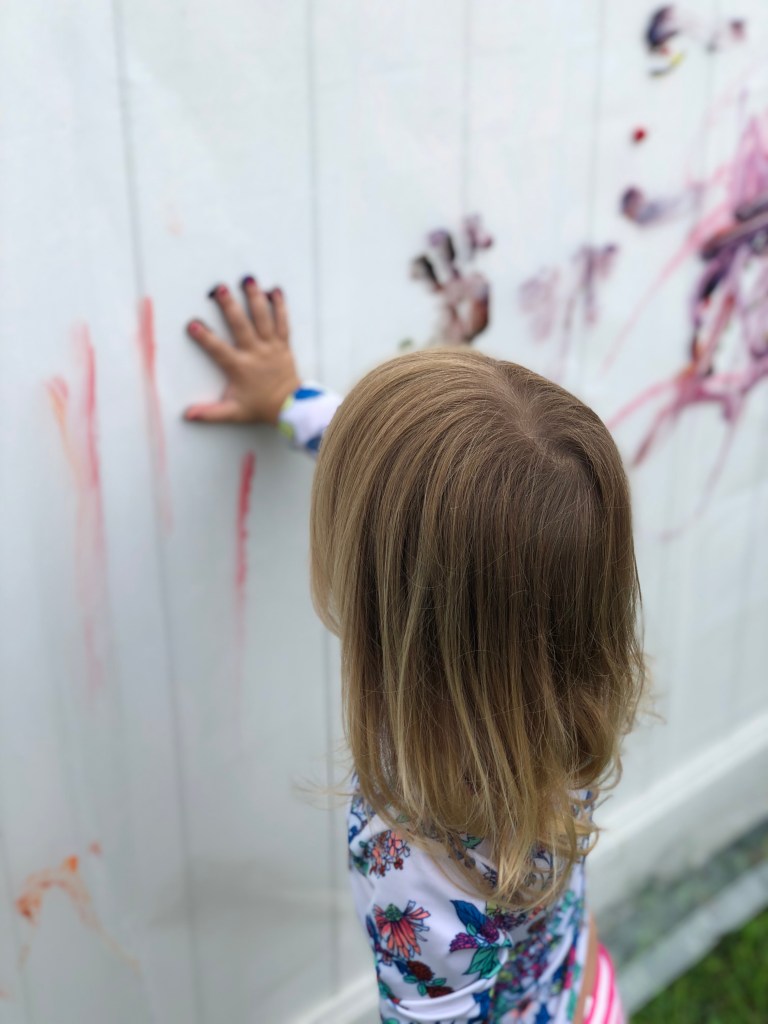 The kids had so much fun smearing the paint on the curtain together and making handprints all over. Grayson is already requesting to paint again! I am sure this will be an activity we do many more times over the summer. The best part, clean up was so easy. Spray everything with the hose, from the kids to the curtain. The paint washed out and I kept it hung up to dry.