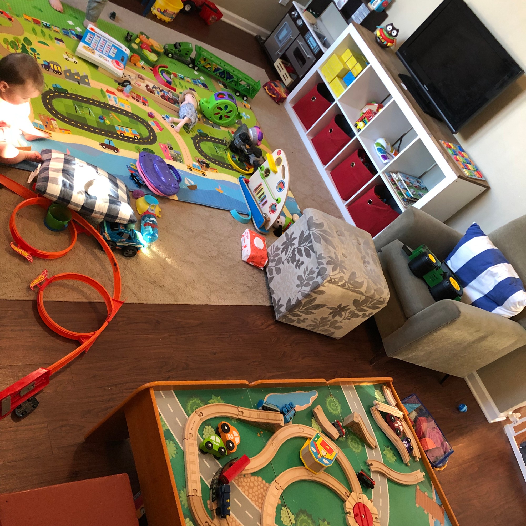 Cranes, trains, and automobiles are just a few of our favorite things. With that being said, we have a TON of vehicles throughout our house. These vehicles sometimes need to place to go (other than under my feet!). So, we grabbed some painters tape and created a race track! But, what’s a race track without some tunnels and bridges?! Thank you solo cups! The tracks don’t have to stay on the ground. Up the walls, over the couches, and down the kitchen drawers are all fun places for their cars to travel.