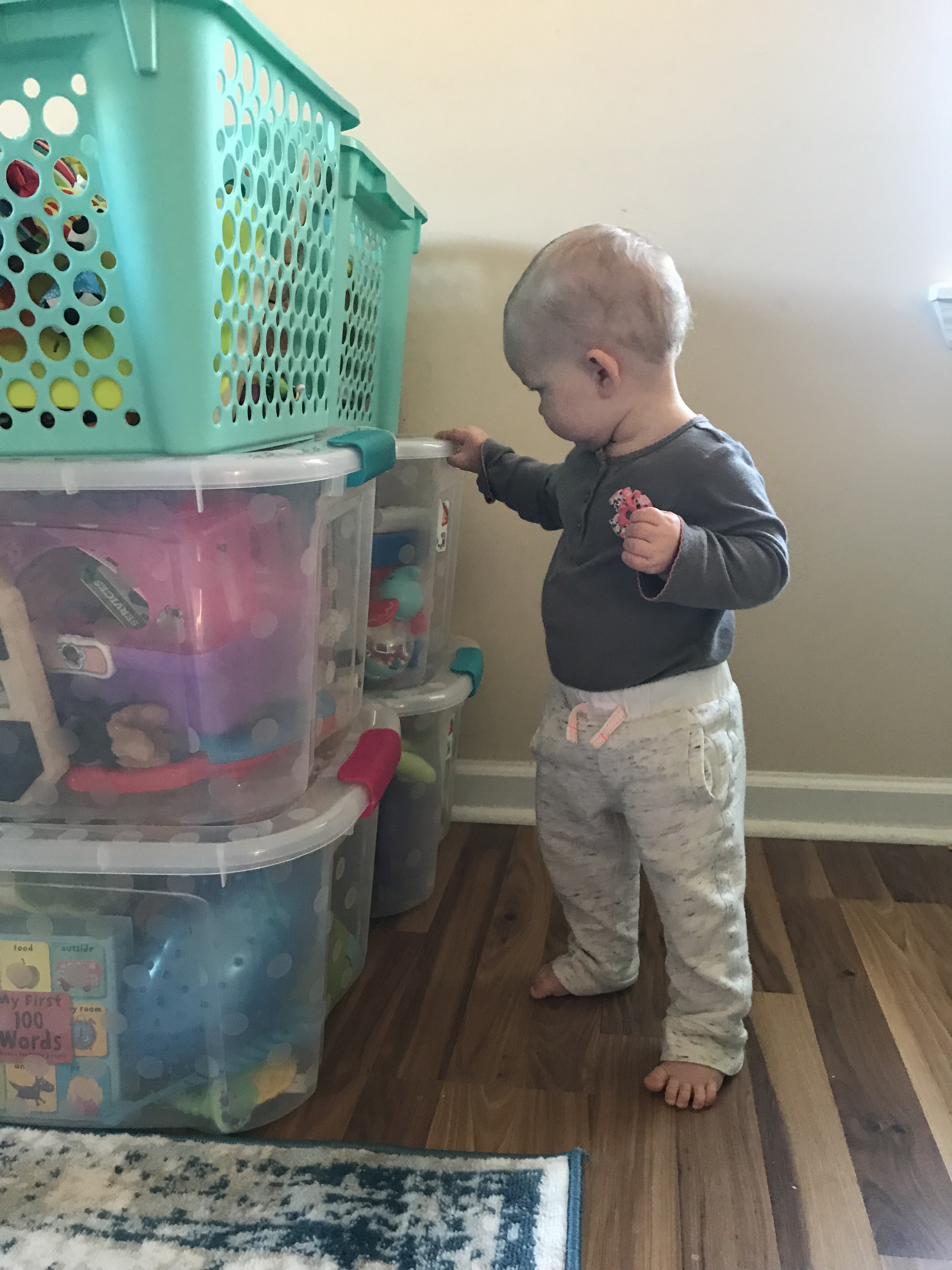 Sensory bins are a great way to let your little ones explore different textures, colors, and concepts. Everything is contained in a big plastic tub, or so it’s supposed to be, which makes for easy clean up! Find a plastic tub you have laying around the house and fill it with whatever interests your child. We currently LOVE construction of any kind. So, off I went to the garage, got some soil and rocks and ta-da! A sensory bin was created!