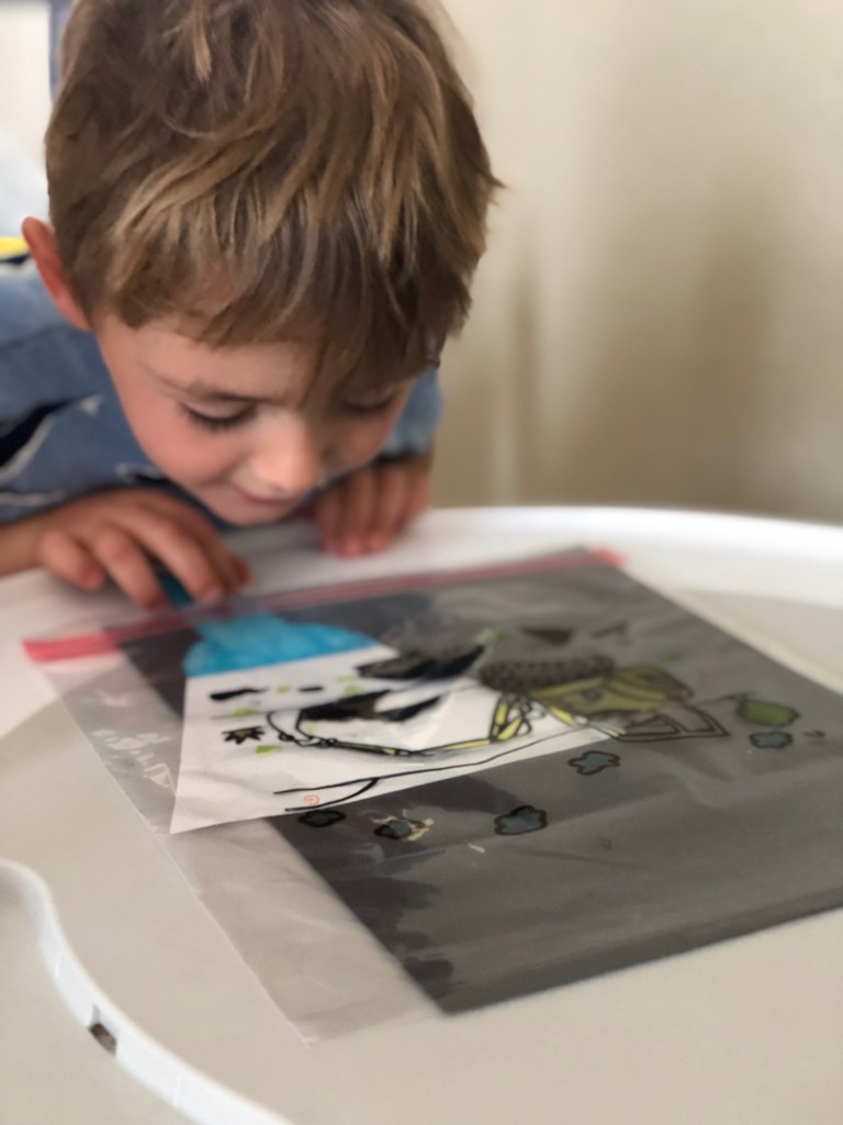 Depending on your child’s ability, have them sort by color or just dump the pom poms from one container to another. For my oldest, I gave him some tweezers to make it just a little more challenging. He not only had to sort the poms by color, but also use his fine motor skills to transfer the poms from the container to the cups.