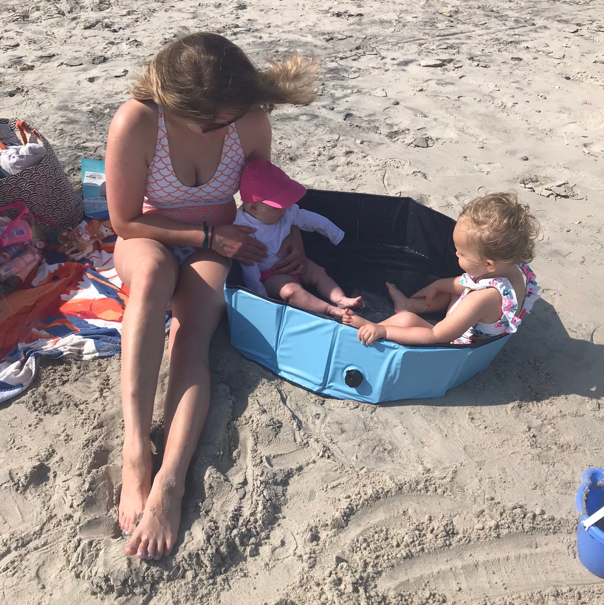 Flip that bad boy upside down, put something in each corner to hold the sides up, and just like that you have a little “sand free” area. This is great for when your little one isn’t mobile. It makes a safe area for them to lay, crawl, and sit without sand getting everywhere. Now, if you have mobile kiddos this will not stay sand free for long, but probably a little more so than a normal towel or beach mat.