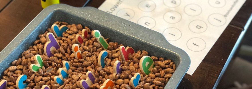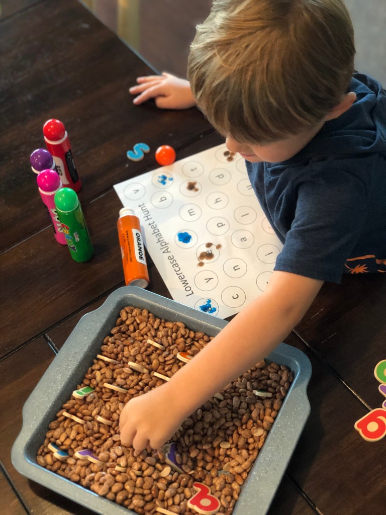 To get started, fill your container with the beans. Stick the letters in the beans so that the tops are shown. Let your little one pick out a letter and then find it on their paper.