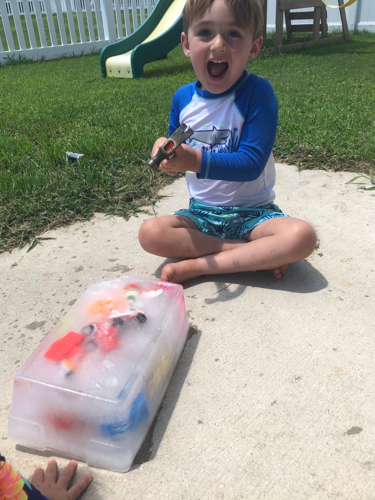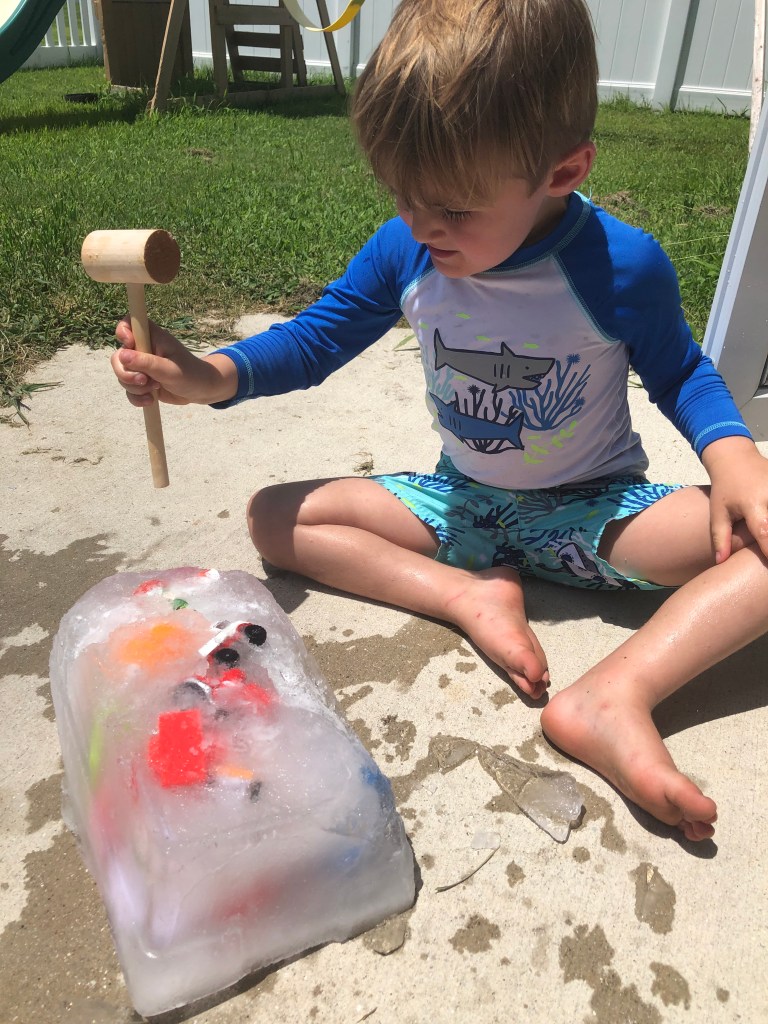 We started off using a hammer to break big chunks of ice off. Gray was so excited to be able to use a hammer. He is a Mr. Fix it, so using a big hammer made his day! Once we got large chunks off we moved to using the mallet, so we didn’t break any of the plastic toys.